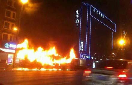公交車只燒剩個車架,事故造成6名乘客受傷。