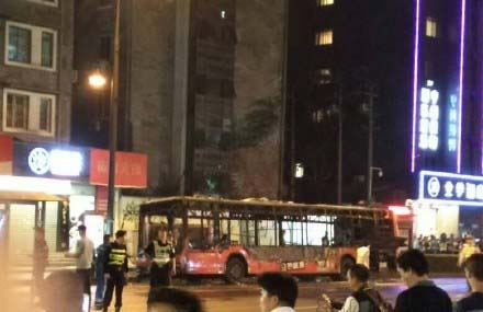 公交車只燒剩個車架,事故造成6名乘客受傷。